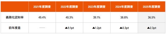 自転車保険の加入が義務付けられている地域にお住まいの方を対象に、義務化についての認知状況を調査したところ、「知っている」と回答した人の割合は36.5%にとどまりました。これは、前年度から2.3ポイント低下しており、2021年度の49.4%から4年連続で低下しています【表2】。