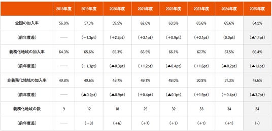 2.義務化地域での加入率は66.4%と高水準を維持するも、2年連続で低下