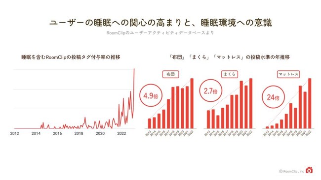睡眠については、RoomClip住文化研究所の調査にて生活者の高い関心があることがわかっています。「快眠」を主題にしたベッドルームの改善がトレンドとなり、RoomClip Award2022(※2)においてキーワードランキング3位に「快眠ベッドルーム」がランクインしました。