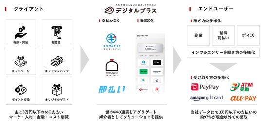 世の中の通貨をアグリゲート。「デジタルギフト(R)」「デジタルウォレット」「即払い」の特性を活かし、クライアントの支払いDXから、エンドユーザーの稼ぎ方・受け取り方の多様化に合わせたソリューションを提供しております。