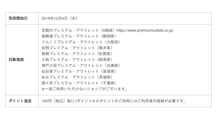 三菱地所・サイモン株式会社(本社:東京都千代田区、代表取締役社長:山岸 正紀)が運営する全国9か所のプレミアム・アウトレットでは、アウトレットモールとしては初めて、2019年12月4日(水)から、株式会社NTTドコモが提供するポイントサービス「dポイント」の導入を開始します。