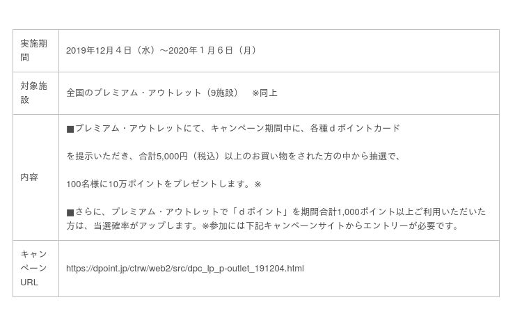 また、「dポイント」の導入開始を記念して、同日の12月4日(水)から2020年1月6日(月)まで、プレミアム・アウトレットで各種dポイントカードをご利用いただくと、10万ポイントが100名様に当たるキャンペーンを開催します。