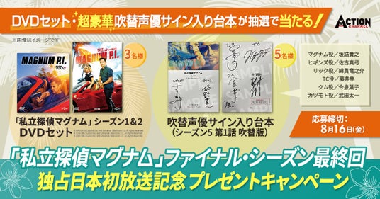 日本唯一の(*1)アクション海外ドラマ専門チャンネル「アクションチャンネル」(旧AXN)(AXN株式会社、本社:東京都渋谷区、代表取締役社長 大園天樹)は、長らく愛されてきたハワイが舞台の大人気アクションドラマ「私立探偵マグナム」のファイナル・シーズン最終回をいよいよ8月10日(土)に独占日本初放送(*2)します。最終回放送当日は、ファイナル・シーズンを第1話から復習できるキャッチアップ一挙放送も行いますので、この機会に是非ご覧ください。また、最終回放送を記念して、DVDセットや、吹替声優サイン入り台本が当たるプレゼントキャンペーンを実施します。さらに、アクションチャンネルWEBサイトでは、吹替声優の皆様の特別インタビューを公開中です。放送と合わせてお楽しみください。