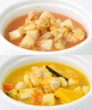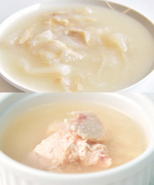 鶏肉をガラスープで煮込んだシンプルな製品。鶏肉はカルシウムに対してリンの含有量が50倍と高リン食品ですが、卵殻カルシウムを加えカルシウムとリンのバランスを整えています。