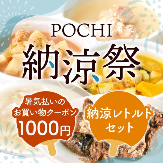 プレミアムドッグフードメーカー「POCHI」(運営:マーケティングパートナー株式会社、本社所在地:東京都新宿区、代表取締役社長:権田真司、Tel:03-6772-8194、https://www.pochi.co.jp/)は、8月20日(火)よりPOCHI納涼祭(キャンペーン)を開催いたします。お買い物1,000円クーポンをご用意したほか、暑さで疲れた犬の体をいたわるレトルトセットを特別販売します。ビタミン・ミネラルが豊富なブロッコリーや、リコピンを豊富に含むトマトが入ったスープなど、夏バテ気味の愛犬の体にうれしいレトルト5種(1袋ずつ)を特別にセレクトしたセットです。通常価格(2,535円)より25.4%OFFの1,890円(税込)でのご提供です。(数量限定での提供となっており、なくなり次第販売終了となります。)