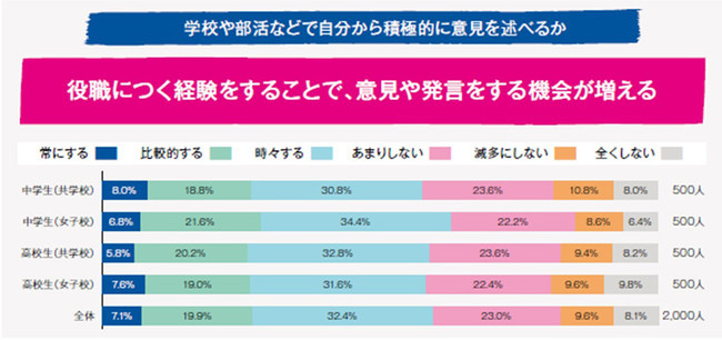 「学校や部活などで自分から積極的に意見を述べるか」については、「常にする(7.1%)」、「比較的する(19.9%)」であり、意見を述べたり、発言したりすることにあまり積極的とは言えない現状が浮き彫りになりました。一方、役職経験の有無で比較すると、クラス委員長(354人)や生徒会役員(212人)などの役職経験がある場合は、「常にする」「比較的する」が、いずれも50%を上回りました。これまでのリーダー経験が人前で意見を述べたり、発言したりすることを容易にさせると考えられます。