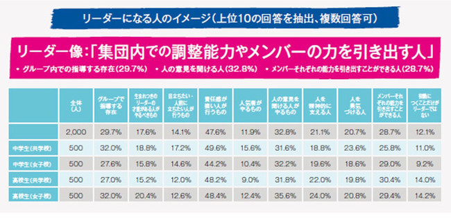 リーダーのイメージは、「責任感が強い人がするもの」(47.6%)が最も多く、次いで「人の意見を聞ける人」(32.8%)、「グループ内での指導する存在」(29.7%)、「メンバーそれぞれの能力を引き出すことができる人」(28.7%)という結果でした。集団内で責任感があり、メンバーの意見を聞きながらまとめることができる、調整能力を持つ人がリーダーであるといった理解が見られます。専門家はこの結果を肯定的に評価し、佐藤真久・東京都市大学大学院教授は、「社会の変化が激しいなか、関わる多くの人たちのモチベーションを高め、互いの力を持ち寄り、共に協働と学びのプロセスを大切にしながらやっていくことがとても重要です。そのように考えると、場の調整役としてのリーダー像が今後一層重要になってきます」と述べられています。