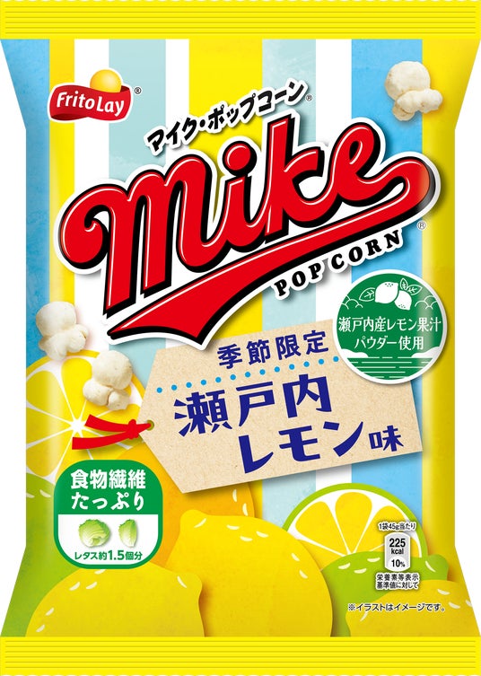 『マイクポップコーン 瀬戸内レモン味』は、瀬戸内産レモンをはじめ、醤油、オリーブオイル、鯛など、瀬戸内を想起させる原料(※1)を使用したポップコーンです。口に入れた瞬間、レモンの爽やかな酸味と香りが口の中いっぱいに広がり、これからの暑い夏の日でもさっぱりと食べられます。また、醤油のコクやオリーブオイルの香り、鯛のうま味を加えることで、味に深みが生まれ、酸っぱさだけでは終わらないやみつきになる味わいに仕上げました。隠し味のブラックペッパーが後味を引き締めることで、飽きのこない味わいを実現しています。