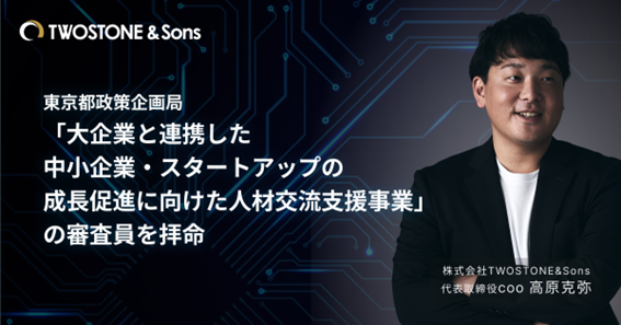 株式会社TWOSTONE&Sons(所在地:東京都渋谷区、代表取締役CEO:河端保志、代表取締役COO:高原克弥、証券コード:7352、以下TWOSTONE&Sons)は、東京都政策企画局が推進する「『未来の東京』戦略」の事業である「大企業と連携した中小企業・スタートアップの成長促進に向けた人材交流支援事業」において、代表取締役COO高原克弥が中小企業・スタートアップの審査員を拝命しましたことをお知らせいたします。
