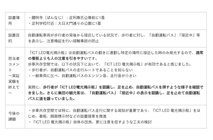 野原グループの株式会社アークノハラ(本社:東京都新宿区、代表取締役社長:岡本力、以下:アークノハラ)は、2023年3月18日(土)~3月27日(月)の期間、栃木県ABCプロジェクト「自動運転バスに乗ろう@足利市」の実証実験(以下、本実証実験)において、歩行者と車両(自転車を含む)の共存空間(以下、歩車共存空間)である自動運転バスの走行路に、「ICT LED電光掲示板(対向接近表示器)」を設置し、歩行者に向けて自動運転バスの接近情報を表示することで、注意喚起と自動運転バスの安全走行、道路交通の安全性向上(自動運転バスとの接触事故防止)に協力しました。