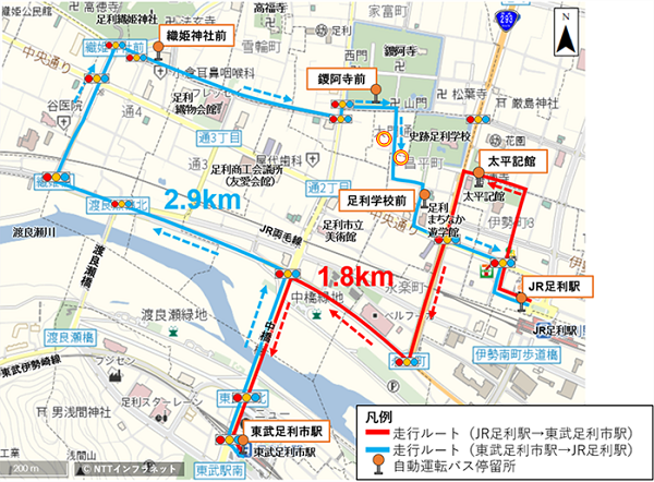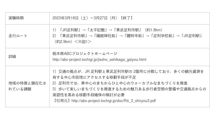 栃木県足利市は、国宝の鑁阿寺(ばんなじ)、日本遺産の史跡足利学校など、多くの歴史的観光資源を有しており、歩いて楽しいまちづくりを推進するための魅力ある歩行者空間の整備や交通拠点からの周遊性を高める移動手段確保の検討が課題とされています。本実証実験では、JR足利駅と東武足利市駅間を結び、市街地の観光施設周辺の歩車共存空間において自動運転バスを運行することで、市街地における周遊性向上やにぎわいの創出、歩車共存空間における自動運転バスの導入可能性の検証を目的として実施されました。