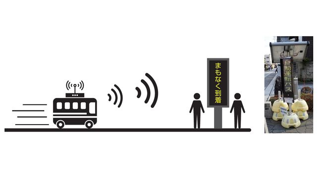 本実証実験では、歩車共存空間に2基を設置しました。歩行者に向けて自動運転バスの接近情報を表示することで、注意喚起と自動運転バスの安全走行、道路交通の安全性向上(自動運転バスとの接触事故防止)に協力しました。