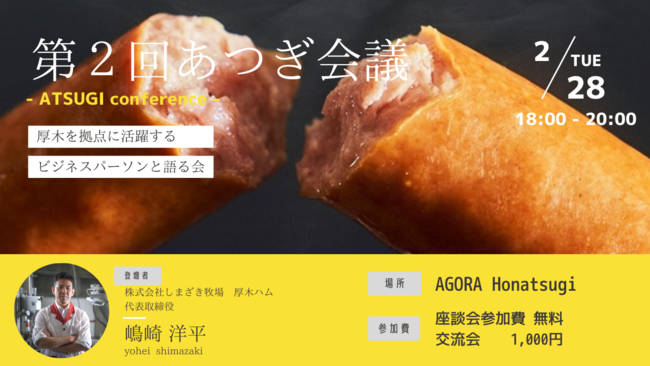 2022年10月より始まった、座談会形式のビジネスイベント「あつぎ会議」。第2回は2023年2月28日(火)、「株式会社しまざき牧場 厚木ハム」代表取締役、嶋崎 洋平(しまざき ようへい)氏をお呼びして、事業やここまでの軌跡を伺います。小田急線本厚木駅直結の本厚木ミロード1.にある「コワーキング&インキュベーションオフィス AGORA Hon-atsugi(あごら ほんあつぎ)」にて、一般の方でも参加可能です。