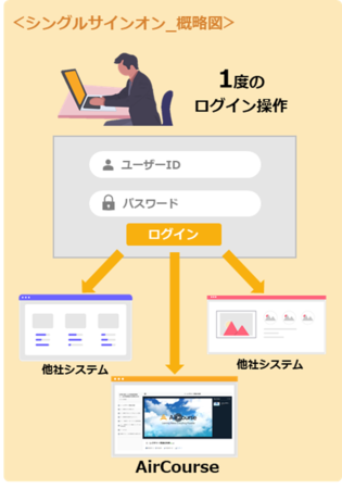 シングルサインオン(SSO:Single Sign On)とは、一度のユーザ認証処理によって、複数のシステムを利用可能にする仕組みです。シングルサインオン機能を利用するとAirCourseとは別のシステムでユーザ認証をすることで、AirCourseのサービスが利用可能になります。AirCourseはフォーム認証だけでなく、SAML認証によるシングルサインオンにも対応しております。