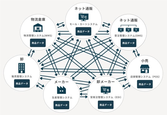 現在、市場の業務管理では、ネット通販のモールやカートシステム、受注管理システム(OMS)、小売の店頭管理システム(POS)、卸の販売管理システムや受発注管理システム、メーカーの生産管理システムやEDI、物流の倉庫管理システム(WMS)など、業種・業態ごとにシステムが存在し、各システムに商品データ(商品マスタ)が存在しています。
