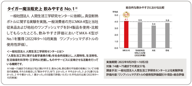 ※1 14歳~75歳までの男女57名に開けやすさ、飲み心地、飲む際の不快感の有無について19項目の実験後、それらを総合した「飲みやすさ」を「5 よかった、4 ややよかった、3 よくも悪くもなかった、2 やや悪かった、1 悪かった」の5段階で評価いただいた平均点の比較(2022年9~10月実施)