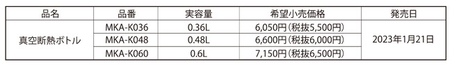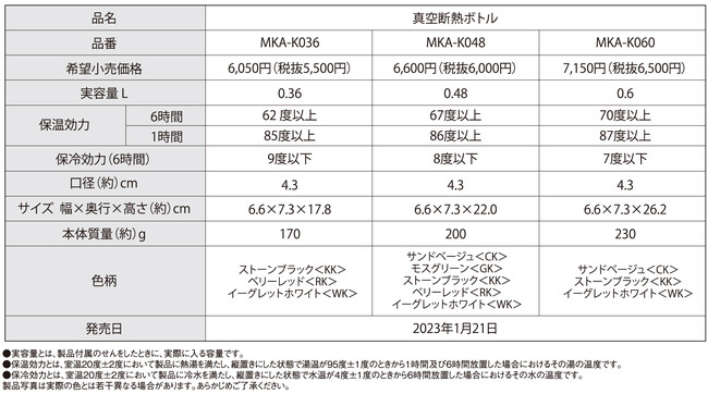 熱制御テクノロジーで世界をリードするタイガー魔法瓶株式会社(社長:菊池嘉聡、本社:大阪府門真市)は、「真空断熱ボトルMKA-K036/K048/K060」を2023年1月21日(土)に発売いたします。