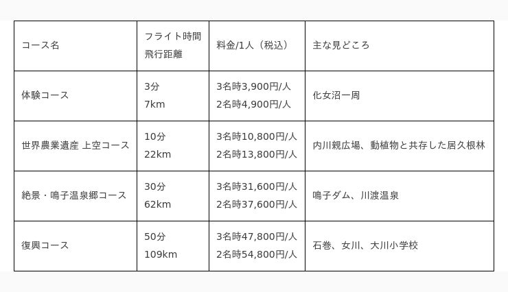 ヘリコプターに初めて乗る方も安心の「体験コース」から、東北の復興を空からご覧いただける「復興コース」まで多様なコースを展開しております。