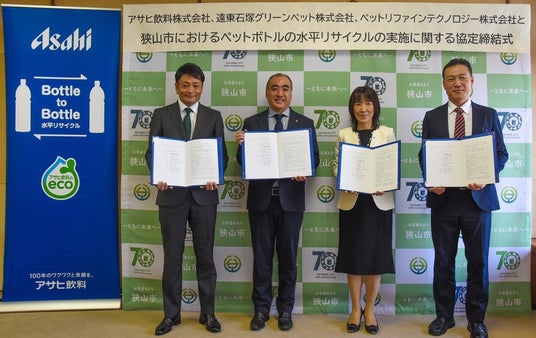株式会社JEPLAN(代表取締役 執行役員社長:高尾 正樹、以下「JEPLAN」)のグループ会社であるペットリファインテクノロジー株式会社(代表取締役 執行役員社長:伊賀 大悟、以下「ペットリファインテクノロジー」)は、埼玉県狭山市(市長:小谷野 剛)、アサヒ飲料株式会社(代表取締役社長:米女 太一、以下「アサヒ飲料」)、遠東石塚グリーンペット株式会社(代表取締役社長:安田 真一、以下、「遠東石塚グリーンペット」)とともに、日本国内のペットボトルの循環利用の推進を目的とした「ペットボトルの水平リサイクルに関する協定」を3月25日(火)に締結しました。また、同日に協定書に署名をする締結式を行いましたので、お知らせします。