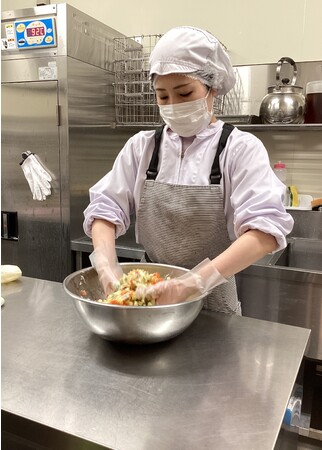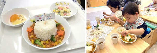 2022年末に「にじいろ保育園」の園児を対象として実施したアンケートでは、家で食べる好きな食べ物・保育園の給食で食べる好きな献立ともに、1位はカレーライスとなりました。園児が最も好きな献立から食に興味を持たせたいとの思いから、「にじいろの日」ではメインに「にじいろカレー」を取り入れた「にじいろ給食」の提供をスタートしました。その他、にじいろサラダ、キラキラフルーツゼリーなど見た目から子どもたちの興味をひく献立を企画しています。