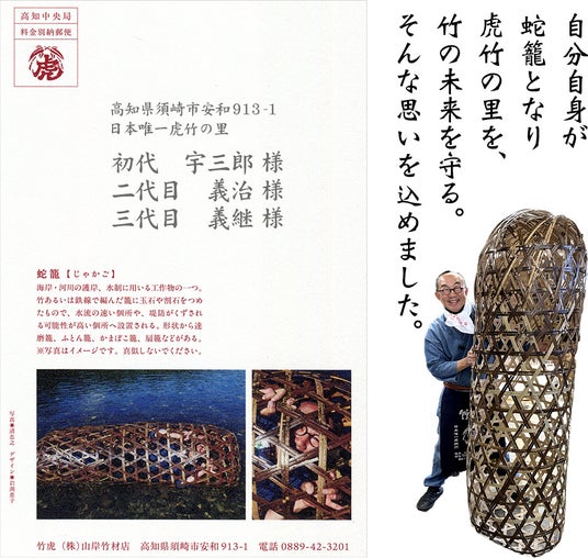 蛇籠は、竹などを編んで作られた籠に石を詰め込み、河川の氾濫や土砂崩れを防ぐための工作物です。海岸や川の護岸、水流の速い箇所や堤防が崩される恐れのある場所に設置され、その堅牢さと機能性で地域を守っています。竹は成長が早く、継続利用可能な自然素材として現代社会のニーズに合致しています。伐採後も強靭な地下茎が残り、再び生えてくるところから、持続可能な天然資源として注目されています。当社代表取締役社長である山岸義浩 竹虎四代目は、『自分自身が蛇籠となり、「虎竹の里」を、竹の未来を守る。』という想いを込め、今回の新春挨拶状制作に取り組みました。