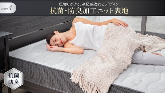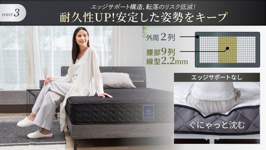 マットレスの端まで強化された特殊構造により、端に座っても沈み込みにくく、高い安定感を実現。振動が伝わりにくいため、睡眠を妨げることなく快適な休息をサポートします。また、外周2列を強化することで耐久性が向上し、長期間お使いいただけるため、コストパフォーマンスにも優れています。さらに、側面には通気性の良いメッシュ生地を採用し、ムレを軽減して快適な使用感を提供します。