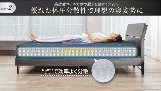 独立したコイル一つひとつが体型や寝姿勢に細かくフィットし、圧力を効果的に分散することで理想的な寝姿勢をサポートします。体格の良い方にも安心してご使用いただける設計です。さらに、腰部を強化することで自然な寝返りを促し、寝付きの悪さや夜中に目が覚める不安を軽減します。