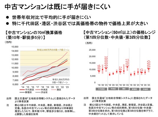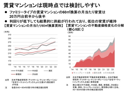 - 都心において新築マンションの代替となってきた中古マンションだが、パワーカップルにとっても価格上昇に追随しにくい状況となりつつある。今後は相対的に割安感のある賃貸マンションへの選好が強まるだろう。さらには、従前以上に都心5区以外の都区部、郊外への流出も想定される。