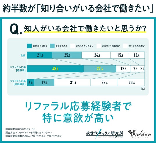 「知り合いがいる会社で働きたいと思うか」を尋ねたところ、全体の46.4%が「そう思う」と回答しました。リファラル応募経験者では75.6%、未経験者では23.0%と、経験の有無によって約53ポイントの差が見られました。
