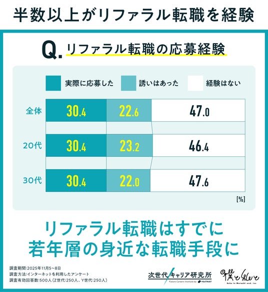 20~30代の半数以上がリファラルでの転職の誘いを受けた経験あり。リファラル採用は一部の業界や職種に限られた手法ではなく、若年層にとってすでに身近な転職手段の一つとなっています。