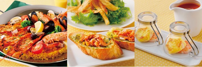 海老のうまみがしみ込んだ具だくさんの「赤海老のパエリア アイオリソース添え」や、一口サイズでおしゃべりしながら楽しみたい「甘海老のアミューズ」「桜海老・抹茶の柚子風味トースト」など全6品をご用意いたします。