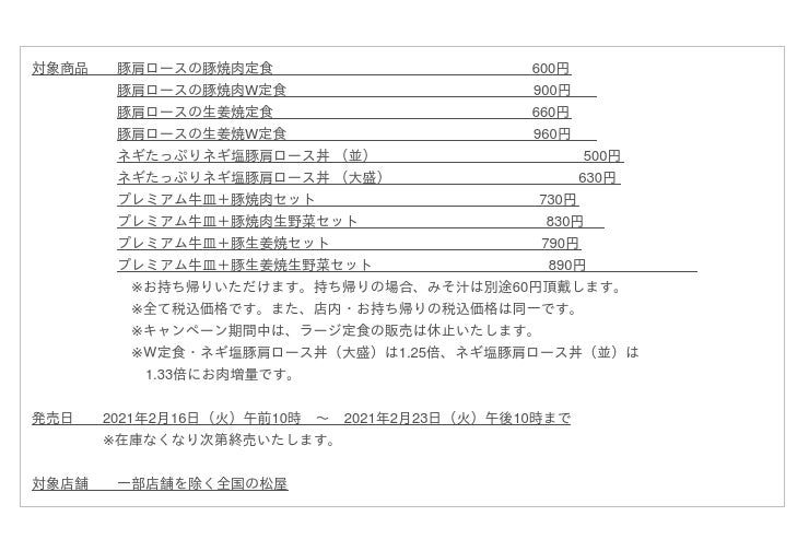 松屋の人気定番メニュー「豚肩ロースの豚焼肉定食」と「豚肩ロースの生姜焼定食」、「ネギたっぷりネギ塩豚肩ロース丼」は、2月23日(火)午前10時をもって販売終了し、新商品にリニューアルいたします。今までのご愛顧に感謝の気持ちを込めて、販売終了前1週間限定でお肉が最大1.5倍に増量するキャンペーンを開催いたします。※お肉がなくなり次第販売終了いたします。