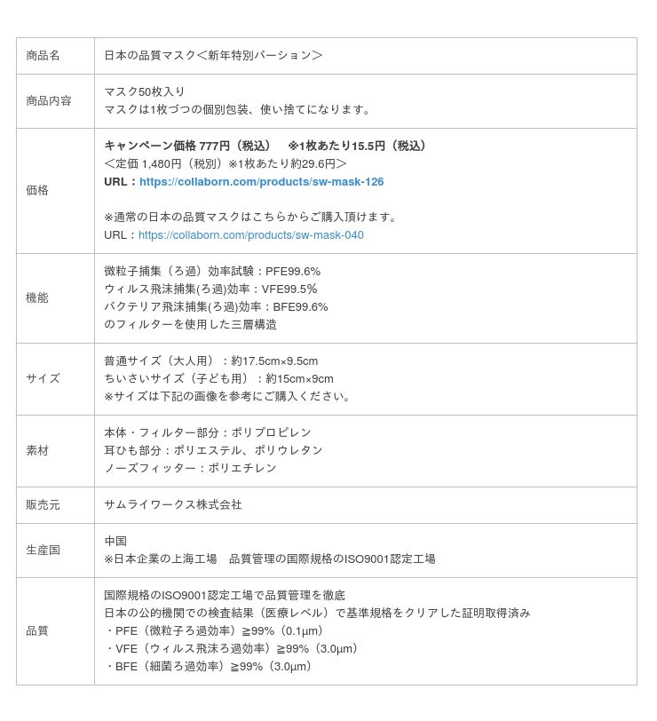 サムライワークス株式会社(代表取締役社長:新島 実 本社所在地:東京都渋谷区)は、「日本の品質マスク」の新年特別バージョンを追加販売を行います。「日本の品質マスク」は品質管理の国際規格ISO9001の認定工場で、品質管理を徹底して製造され、又日本の検査機関でフィルター性能が、PFE99.6%、BFE99.6%、VFE99.5%の証明を取得した、安心・安全の高品質不織布マスクです。今回大変多くのお客様にご好評をいただいております、お年賀や大切な人へお贈りいただける新年特別バージョンの限定パッケージでご用意した、『日本の品質マスク』の追加販売が決定致しました!お年賀の贈り物としてご利用いただけるよう社名やお名前をご自由にお書き頂けるスペースを設けております。安全を大切な人へ。