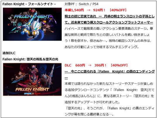追加DLCにさらなる新ストーリー追加の『Fallen Knight』や初セールとなる『とうほう夜雀食堂』もお得に!