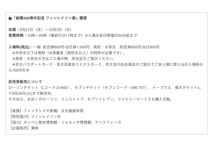 株式会社京王百貨店(本社:東京都新宿区、社長:仲岡一紀)新宿店では、9月21日(水)~10月3日(月)の期間、7階大催場にて首都圏初となる「創業200周年記念 フィンレイソン展 -フィンランドの暮らしに愛され続けたテキスタイル-」を開催します。