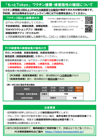 ・接種済証またはPCR検査等結果通知書(撮影画像、コピー、電子的な証明書でも可)の確認は、同行者も含めて旅行者全員について実施しますので、チェックイン時(旅行会社の場合は予約証明書等お渡しの来店時)にご提示ください。提示のない場合は割引支援を受けることができません。