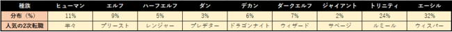各種族の分布は2次転職を完了したキャラクターを対象に集計し、「R.O.H.A.N. Revision」より新たに登場した「エーシル」が最も多く、チュートリアルで二次転職ができるトリニティがその次に多い結果なりました。以降はヒューマンやエルフ、ダークエルフといったファンタジーRPGの定番でなおかつ役割が分かりやすい種族が選ばれる傾向となっていました。
