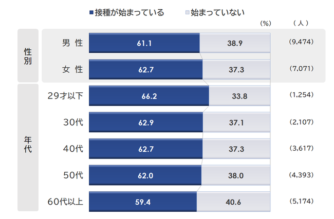 国内メーカー製ワクチンの年内接種は、性別に関わらず6割強の方が「接種が始まってている」と予想されています。年代別では29才以下の若年層にやや「接種開始」予想が多くなっているものの大きな差は見られません。