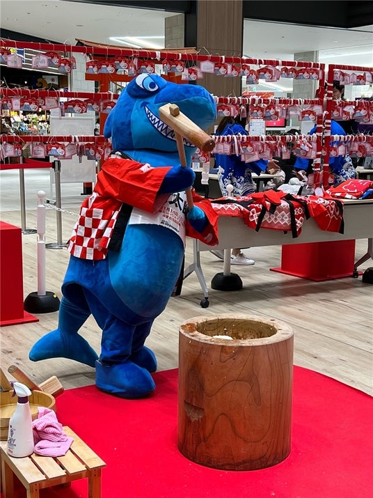 正月の餅つきイベントに参加するマスコットキャラクター「鮫太朗(さめたろう)」