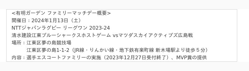 住友不動産商業マネジメント株式会社(本社:東京都新宿区 代表取締役社長:山本 直人)が運営する商業施設「住友不動産 ショッピングシティ 有明ガーデン」(所在:東京都江東区)は、「JAPAN RUGBY LEAGUE ONE」に所属する「清水建設江東ブルーシャークス」の公式戦ホストゲームにおいて、『有明ガーデン ファミリーマッチデー』を開催いたします。