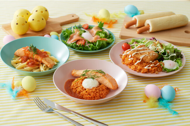 スウェーデンでイースターの時期によく食べられるサーモン料理。脂がのったサーモンフィレを楽しめるメニューとして、ケチャップライスとペンネがメインの2種類をご用意しました。ほかにも、イースターには欠かせない卵やチキンのメニューも登場します。環境負荷の少ないプラントベースチキン オーバーライスや、毎年人気のかわいらしいひよこパンや卵のタルタルソースで仕上げたフレンチドッグなど、今だけの期間限定メニューがそろっています。イケアでイースターを楽しもう!