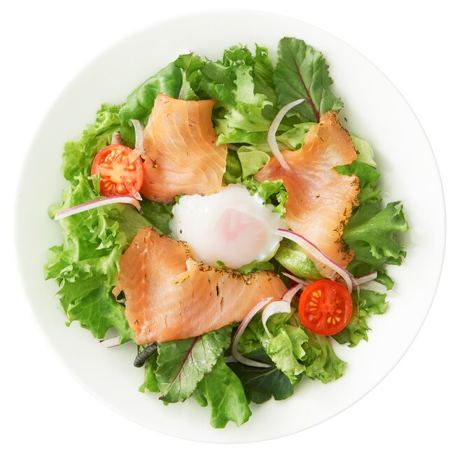 一度食べたらくせになる、大人気のサーモンマリネがのったサラダです。とろりとした温泉卵と一緒に召し上がれ。