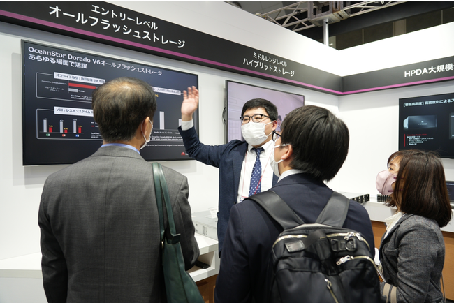 法人ビジネス事業本部はオールフラッシュ、ハイブリッド、分散型の3つの各シナリオに対応するストレージ製品やスイッチ製品の実機を展示しています。