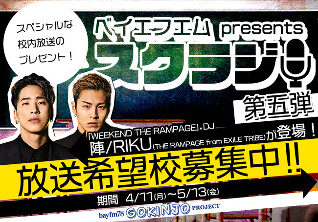 今回は、毎週金曜日23時から放送中「WEEKEND THE RAMPAGE」のDJを担当する陣とRIKUが登場!小学校用と中学校・高等学校用の2種類の番組を制作しました。小学校用は『目標を立てて頑張った事・クラスメイトと仲良くするコツ!』、中学校・高等学校用は『新しいスタートを切ろう!』をテーマに、DJセレクトの楽曲を含む前編、後編合計25分程度(各12分程度)の番組をお届けします!
