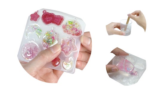 特徴:ストラップやブレスレットなどキラキラかわいいアレンジチャームを作ろう!型やボールチェン、ラメなど買ってすぐ作れる嬉しい材料全部入り。2液タイプのエポキシレジンで固まるからUVライトや電子レンジなども不要でお子様でも簡単に作れます。