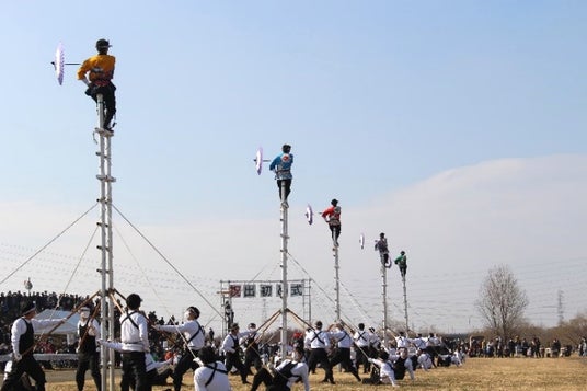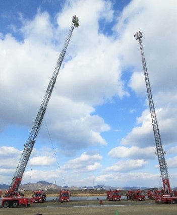 恒例となっている出初め式では、制服を着用した消防職員・消防団員による行進や消防団員によるはしご乗り演技、消防車による一斉放水などが行われます。一級河川加古川に向けて放水する模様は圧巻で、他では見られない加古川市ならではの式典です。毎年、市内外から多くの方が見学に来られます。