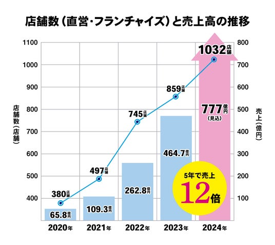 『買取大吉』は、貴金属・中古ブランド品・時計を中心とした買取専門チェーンです。2010年創業以来、直営店とフランチャイズ加盟店ともに増店を続けてまいりました。2024年7月には1,000店舗目の出店を達成し、現在も毎月10~20店舗という驚異的なペースで増店中です。さらに、2024年期の売上高は777億円と、5年で12倍の増益増収となりました。(※下記グラフ参照)