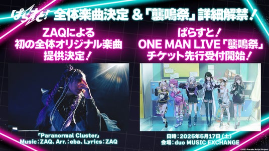 株式会社ClaN Entertainment(本社:東京都港区、代表取締役社長:大井 基行、以下ClaN)は、リアルとバーチャルでパラレルに活動するVTuberプロジェクト「ぱらすと!」から、アニソンクリエイター「ZAQ」の楽曲提供によってグループ初の全体楽曲「Paranormal cluster」のリリース、また5/17(土)開催のワンマンライブ「ぱらすと! ONE MAN LIVE「襲鳴祭」」のチケット先行受付開始をお知らせします。