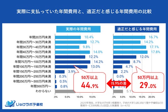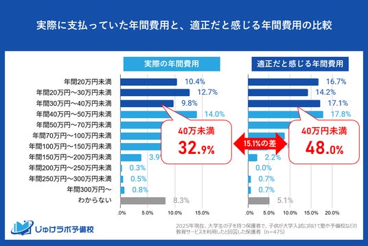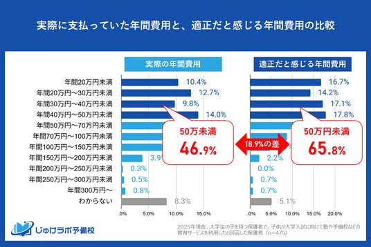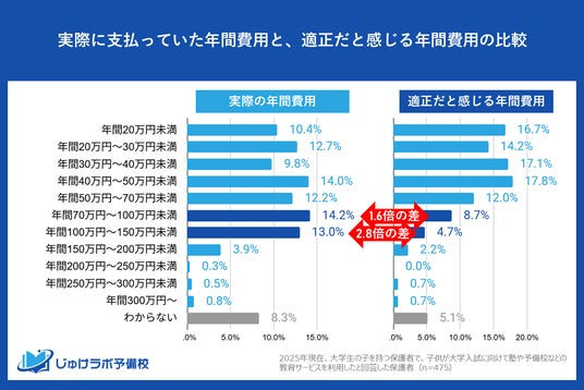 じゅけラボ予備校(所在地:大阪市北区、代表取締役:後藤智則)は、現在大学生のお子様を持つ保護者のうち、大学受験対策で教育サービスを利用した475名を対象に、「大学受験期の年間教育費」に関する意識調査を実施しました。