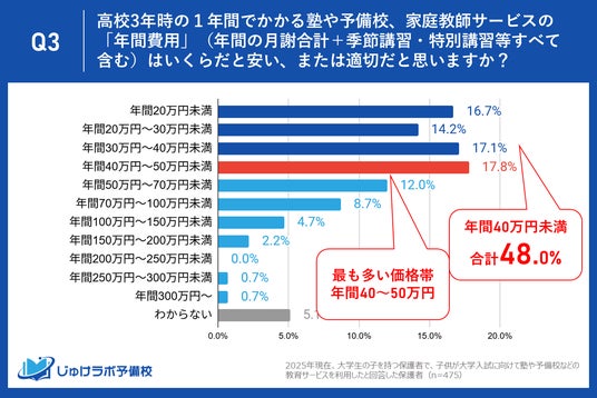 保護者が「安い」または「適切だ」と感じる年間の塾・予備校費用はいくらかを調査したところ、保護者の本音を示す興味深い結果が得られました。